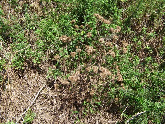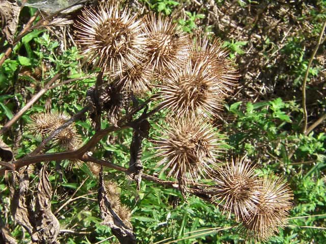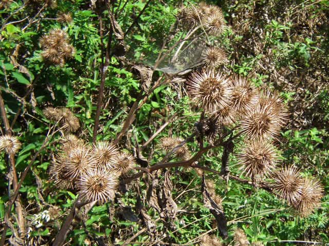 | 越年草 ユウラシア原産。食用として栽培されるが、路傍などに野性化する。茎は分枝し、150cm程度。根生葉は叢生し長い柄があり、心臓形で波打つ。葉の長さは40cm内外、暗緑色で、葉裏に綿毛が密生する。分枝した茎先に径40〜45mmで球形の多くの頭花を付け、淡紫色(稀に白色)の筒状花の集合体。総苞はイガ状の細い棘が広がり、先端が鉤状になる。花期は7〜8月。 学名は、Arctium lappa キク科ゴボウ属 |