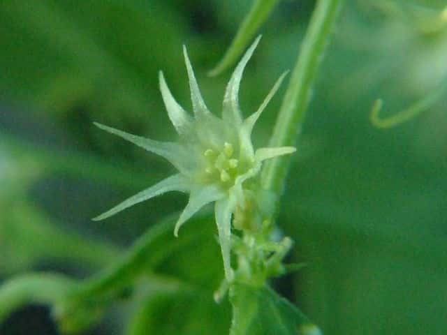| ▼雄花には雄しべが5個ある。 | ▼果実。 | ▼熟すと蓋がとれるように横に割れる。 |