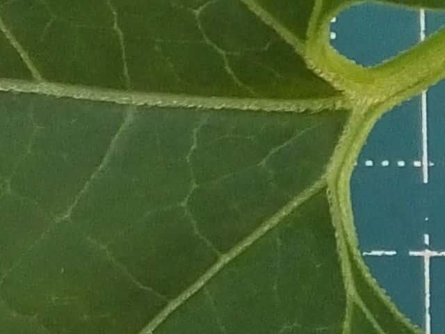 | ▼葉は長さ約14cm。 | ▼葉脈に短毛がある。 | |
