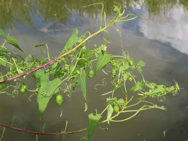 | つる性1年草 北海道〜九州の水辺に生える。葉は長さ5〜10cm、幅2.5〜7cmの三角状披針形で、先端は尖る。葉腋から花序をだし、小さな黄緑色の花をつける。雌雄同株。花序の上部に雄花が総状につき、基部に雌花が1個つく。花は5全裂し、裂片は細長い。萼も同じ形なので、花びらが10個あるように見える。雄花の中心部には5個の雄しべがある。雌花は雌しべのまわりには退化した雄しべがある。果実は長さ約1.5cmの蓋果(がいか)で、熟すと横に割れる。なかには黒褐色の種子が縦に2個並んでいる。花期は8〜11月。(野に咲く花) 学名は、Actinostemma tenerum ウリ科ゴキヅル属 |