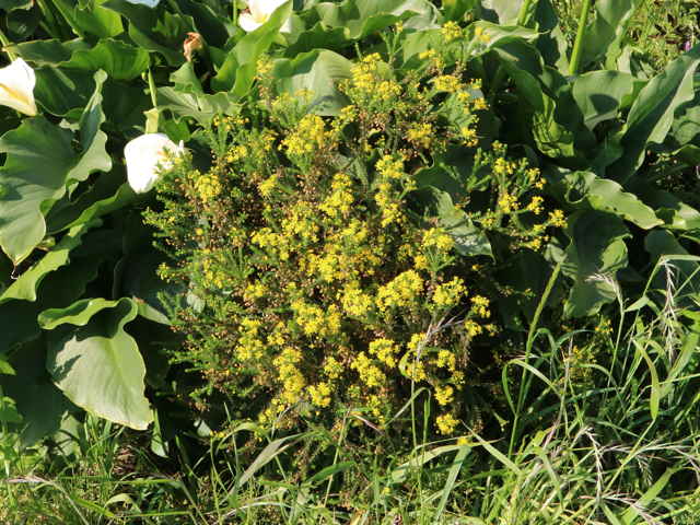 常緑低木 南アフリカ原産の園芸植物。高さ1〜4m。よく分枝する。葉は長さ0.5~1cmとごく小さく、深い切れ込みがあって螺旋状に互生し、鱗のように密にぐるりと枝を覆う。枝先にやや長めの花柄を多数出し、鮮黄色の頭状花を咲かせる。花期は1〜5月。 学名は、Euryops virgineus ’Golden Cracker’ キク科ユリオプス属 |
