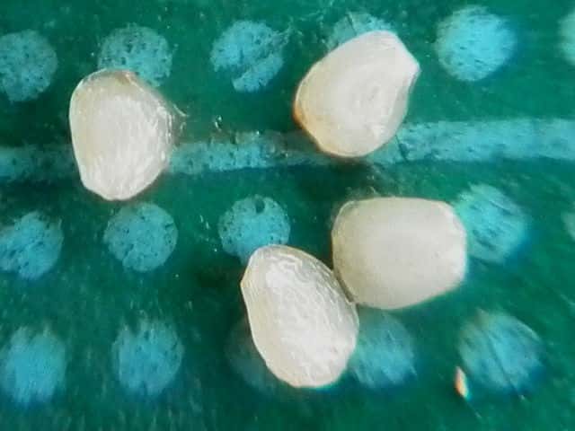 | ▼種子は長さ約1.9mm。(橙色は果肉。) | ▼同心円状の模様がある。 | |
