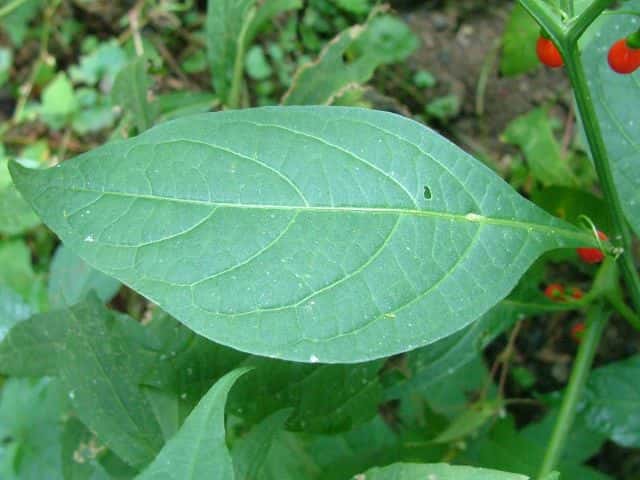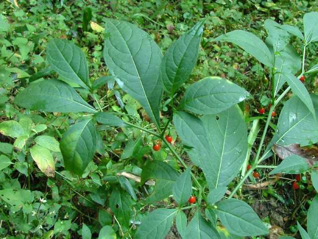 | 多年草 本州〜沖縄の山地の林縁などに生える。茎は高さ60〜90cmになる。葉は卵状長楕円形または長楕円形で長さ8〜18cm、先はとがり、基部は狭まって短い柄となる。無毛で質は薄い。2〜4個の花柄が葉腋から下がり、下向きに花をつける。花冠は淡黄色、鐘形で直径約8mmほど、先は5裂し、裂片はそり返る。萼は小さな浅い皿状で先は平たくなり、分裂しない。液果は球形で直径7〜10mm、赤く熟す。花期は8〜9月。(山に咲く花) 学名は、Tubocapsicum anomalum ナス科ハダカホオズキ属 |