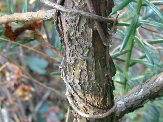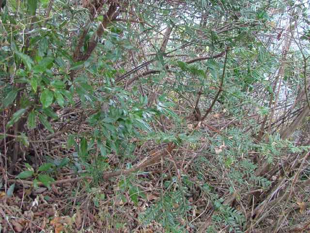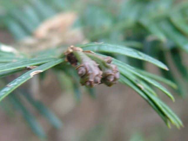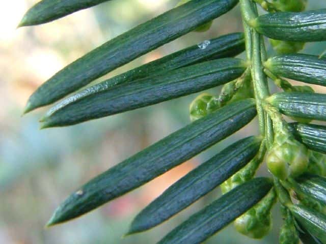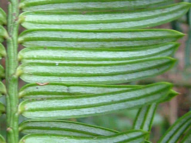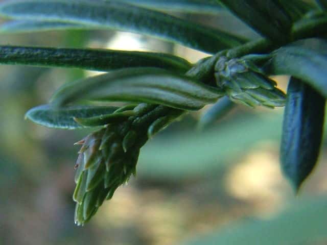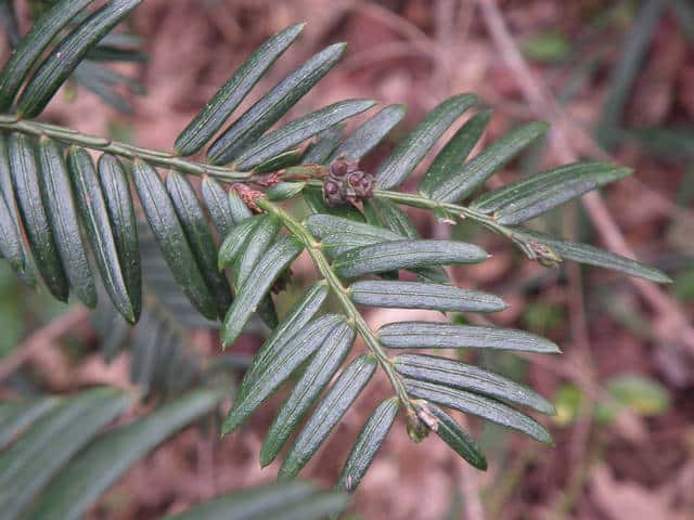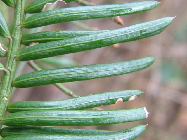 | 常緑低木 北海道西南部〜本州日本海側、四国の落葉広葉樹林の林床に生える。イヌガヤの変種で、多雪地の環境に適応した匍匐型の樹形になる。幹の下部は地面をはい、先端は斜上する。高さは2〜3m。この性質は太平洋側で植えてもあらわれる。葉はイヌガヤより小さく、長さ2.5〜3.5cm、幅2.5〜3mmの線形。表面は暗緑色。裏面は白い気孔帯が目立つ。両面とも主脈がはっきりしている。にぎってもそれほど痛くない。雌雄別株。種子は長さ2〜2.5cmの楕円形。はじめ茶色で、翌年の9〜10月に茶色から熟すと紅色に熟し、白い粉をかぶる。外種皮はやわらかく、ヤニくさいが、甘みがあり食べられる。花期は3〜4月。 学名は、Cephalotaxus harringtonia var. nana イチイ科イヌガヤ属 よく似た木にカヤ、チャボガヤがあるが、葉先に触れると痛く、葉裏の気孔帯の幅が狭い。 |