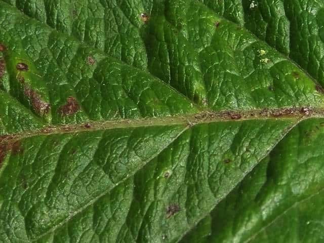 | ▼表面は無毛だが、葉脈に毛がある。 | ▼葉の裏面。 | |
