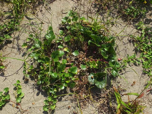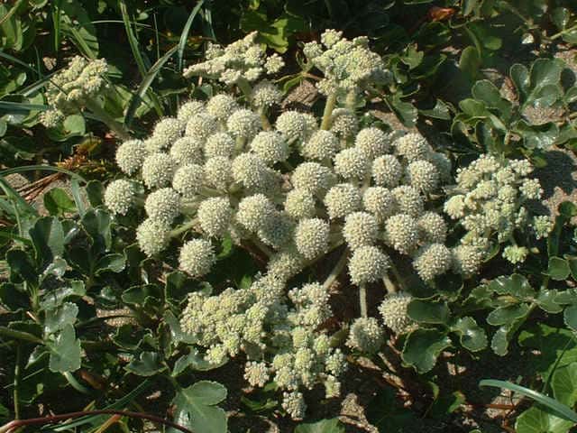| 多年草 日本全土の海岸の砂地に生える。高さ5〜30cm。根は黄色を帯び、太くて長い。茎の上部や花序には白い軟毛が密生する。葉は1〜2回3出羽状腹葉で、厚くて光沢がある。小葉は長さ1.5〜6cmの倒卵状楕円形で不ぞろいの鋸歯がある。茎の先に複散形花序をだし、白色の小さな花を密につける。果実は長さ6〜8mmの倒卵形で隆起線は太く、背面に毛が密生する。花期は6〜7月。(野に咲く花) 学名は、Glehnia littoralis セリ科ハマボウフウ属 |