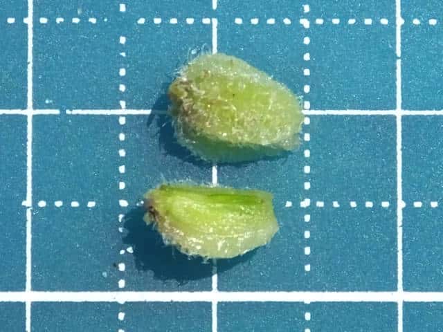 | ▼果実は長さ約8mm、毛が密生する。 | ▼果実は2分果からなる。 | |