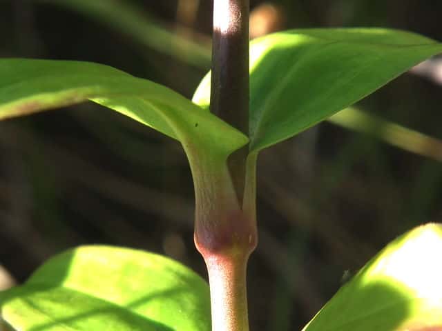 | ▼葉の基部は合着し茎を包む。 | ▼葉は長さ約4cm、厚く光沢がある。 | |