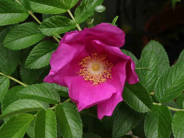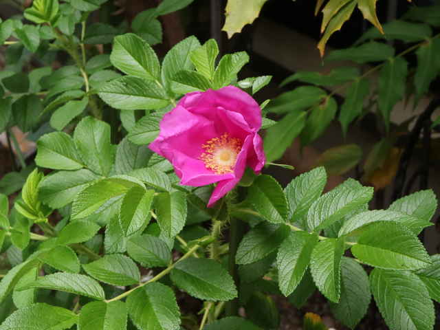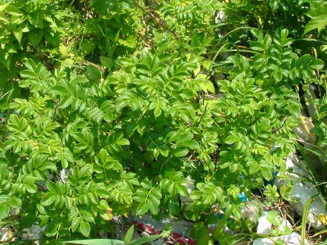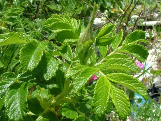 | 落葉低木 北海道〜太平洋側は茨城県、日本海側は島根県までの海岸の砂地に生える。幹は叢生し、高さ1〜1.5mになる。地下茎を伸ばして増え、しばしば大群落をつくる。枝には軟毛があり、太い扁平な刺と針のように小さな刺が混生する。刺にも短毛が密生する。葉は互生。長さ9〜11cmの奇数羽状腹葉で、3〜4対の小葉がある。小葉は長さ2〜3cmの楕円形または卵状楕円形で、先端は丸く、基部は広いくさび形または円形。縁には鈍い鋸歯がある。脈は表面で凹み、しわが多い。裏面には短い軟毛が密生し、腺が混じる。托葉は膜質で幅が広く、中程まで葉柄に合着する。先は尖る。枝先に紅色または紅紫色の花が1〜3個ずつつく。花は直径5〜8cmと大きい。花弁は5個。花柱は有毛、離生し、花ののどの部分をふさぐ。萼筒はほぼ球形。萼片は長さ3〜4cmで、背面に軟毛と細い刺があり、ときに腺毛が混じる。花柄は長さ1〜3cmで、小さな刺がある。果実は偽果。直径2〜3cmの扁球形で、8〜9月に赤く熟す。先端には萼片が残り、中には長さ5〜6mmのそう果が入っている。別名ハマナシ。花期は6〜8月。 冬芽は卵形。葉痕は馬蹄形で上を向く。(樹に咲く花) 学名は、Rosa rugosa バラ科バラ属 白花をつけるものを、品種としてシロバナハマナス(R. rugosa f. alba)という。 鹿島町のハマナスは最初は植栽と思ったが、地元の手入れをしていた人の話では、「子供の頃には砂浜にたくさん生えていたが、今は少なくなった。」とのことであり、自生のものとわかった。 |