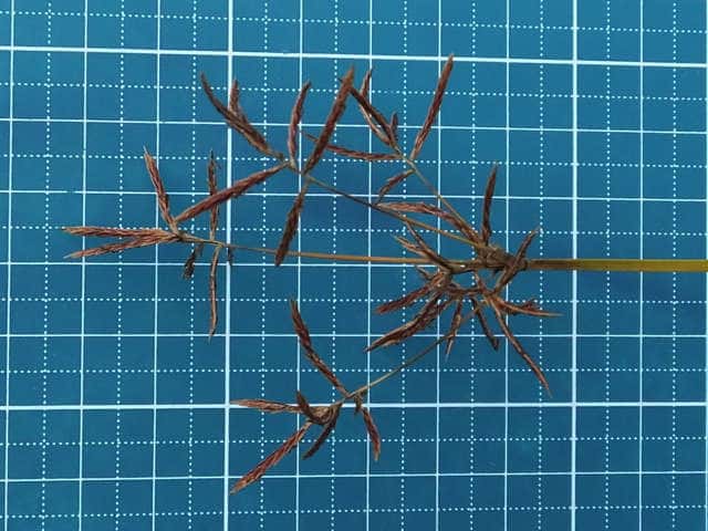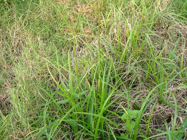| 多年草 関東地方以西〜九州の日当たりのよい海岸の砂地から平地の路傍まで広く分布する。花期後、稈の基部や細長い匐枝の先端に球状の塊茎をつくる。稈は細くて硬く、高さ10〜40cm。葉は幅2〜5mm。花序は単一。花序枝は2〜8本。苞葉の葉身は2〜3枚、花序とほぼ同長。花穂はやや疎または3〜8個の小穂をつける。小穂は線形、長さ1.5〜2cm、中軸に斜開してつき、光沢があり、赤褐色、やや疎らに20〜40個の花をつける。鱗片は狭卵形、斜上してつき、長さ3〜3.5mm、紅褐色、鈍頭〜円頭、中肋はあまり目立たず緑色。そう果は長楕円形、長さ約1.2mm。花柱は長さ約1.5mm。柱頭は3個。花期は7〜10月。(岡山県カヤツリグサ科植物図譜) 学名は、Cyperus rotundus カヤツリグサ科カヤツリグサ属 |
