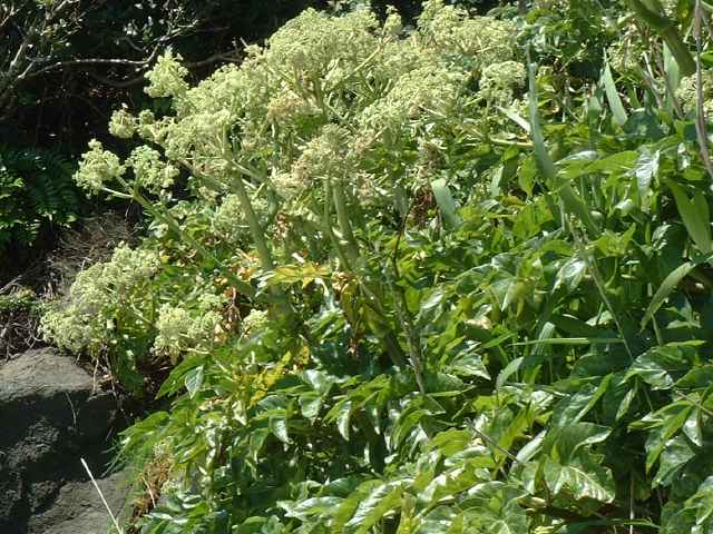 | 多年草 関東地方以西〜沖縄の海岸に生える。高さ1〜1.5m。茎は太くて暗紫色を帯び、上部で枝分かれする。葉は大型の1〜2回3出羽状複葉で、葉柄の基部はふくらんで鞘状になる。小葉は卵状楕円形で厚くて強い光沢があり、ふちには細かい鋸歯がある。枝先から複散形花序を出し、白色の小さな花を密につける。花柄の基部につく総苞片、小花柄の基部の小総苞片はいずれも細長い。果実は扁平な広楕円形、2個の扁平な分果がくっついている。分果は長楕円形で、両側の隆起線が広く翼状にはりだして軍配のように見える。花期は4〜6月。(野に咲く花) 学名は、Angelica japonica セリ科シシウド属 |