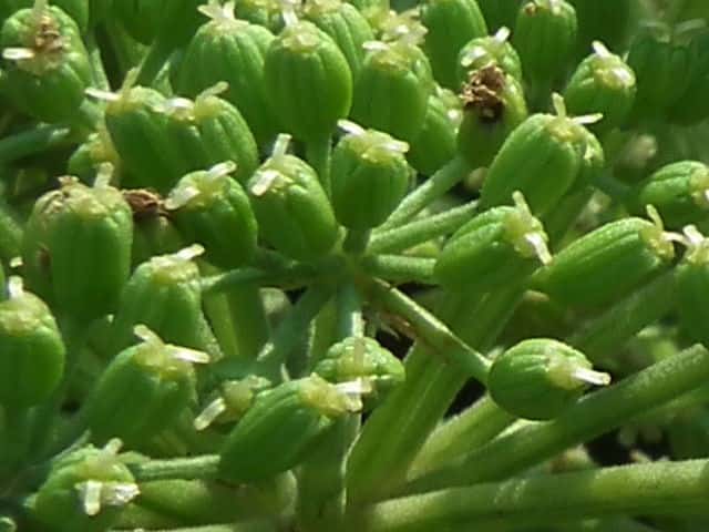 | ▼小花柄の基部に小総苞片がある。 | ▼小さな総苞片がある。 | ▼葉は長さ約90cmの3回3出複葉。 |