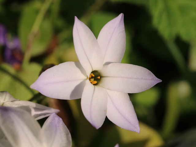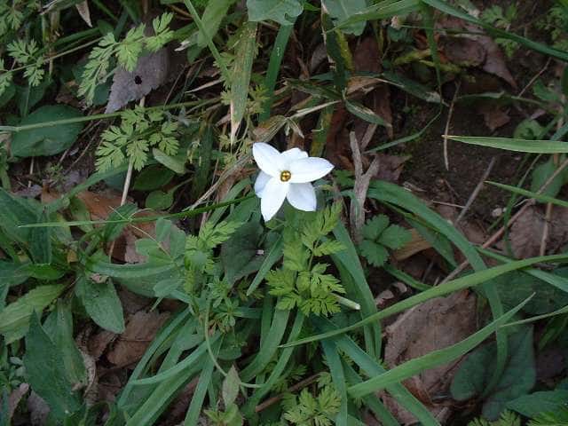 | 多年草 アルゼンチンの原産。明治年間に花卉として導入され、戸外に植え放しでも旺盛に繁殖するため、各地で逸出して帰化状態にある。直径2cmほどの白色の鱗茎から10〜25cmのやや多肉質の線形葉を数枚出し、その間から数本の花茎を出す。花は直径約3cm、白色から淡紫色の6弁花で、花弁中央には紫色の筋が目立つ。花茎に一つ頂生する。全体にニラ臭がある。開花を含めて春期のみ地上に現れる。花期は春。(日本帰化植物写真図鑑) 学名は、Ipheion uniflorum ヒガンバナ科ハナニラ属 |