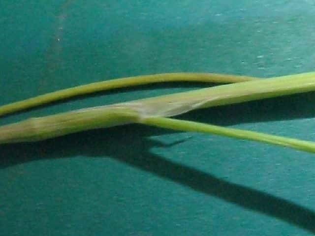| ▼小穂に2小花あるが、1小花のみ芒がある。 | ▼葉舌は大きい。 | |
