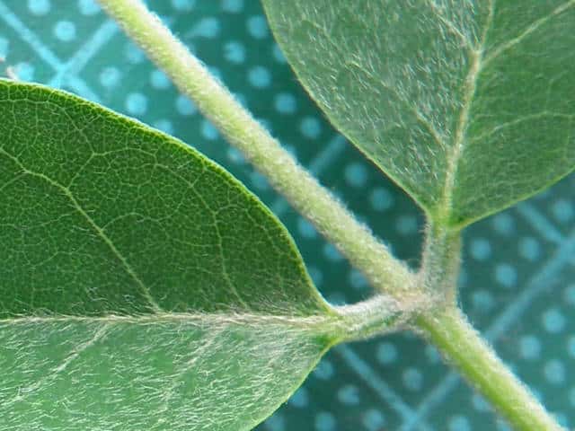 | ▼葉の表面は伏毛があり、葉柄、葉軸に毛が密生する。 | ||