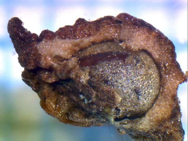 | ▼スポンジ状の果皮の中に種子が1個ある。 | ▼種子は長さ約1.2mm。 | ▼薄く柔らかい皮に包まれている。 |