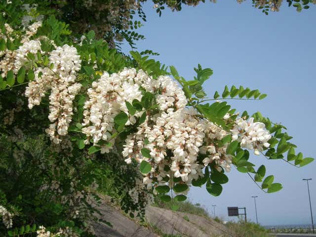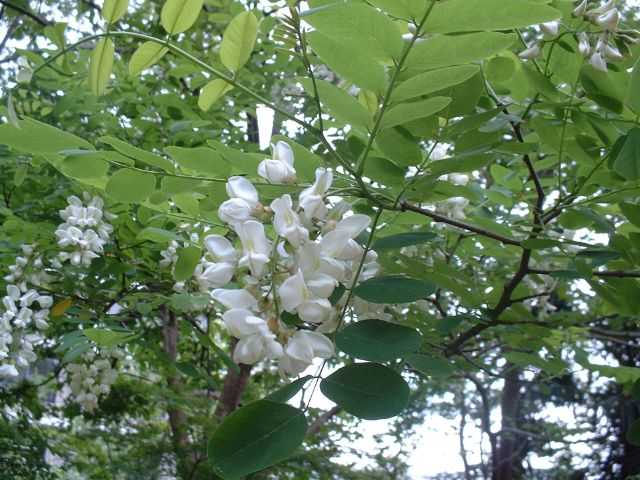 | 落葉高木 北アメリカ原産。明治時代初期に渡来し、各地で砂防用に植えられている。崩壊地、川岸、土手などに野生化しているものも多い。高さ15mほどになる。樹皮は淡褐色。縦の深い割れ目が目立つ。枝はもろく、太い枝でも折れやすい。新枝には稜があり無毛。しばしば托葉が変化した刺がある。葉は互生。長さ12〜25cmの奇数羽状複葉で、3〜11対の小葉がほぼ対生する。小葉は長さ2.5〜5cmの楕円形で全縁。質は薄く、無毛または伏した短毛がある。葉腋から長さ10〜15cmの総状花序を垂らし、香りのよい白色の蝶形花を多数つける。花は長さ約2cm。萼は広鐘形で有毛。上部は5裂する。果実は豆果。長さ5〜10cm、幅1.5〜2cm、背軸側に狭い翼があり、表面は無毛。10月頃に熟し、2つに裂開して、3〜10個の種子をだす。種子は腎臓形で直径約6mm。別名ニセアカシア。花期は5〜6月。 冬芽は葉痕に隠れて見えない。葉痕はまるみのある三角形で大きく、維管束痕は3個。しばしば左右に托葉の変化した刺がある。春になると葉痕に3つの裂け目が入り芽が出てくる。(樹に咲く花) 学名は、Robinia pseudoacacia マメ科ハリエンジュ属 |