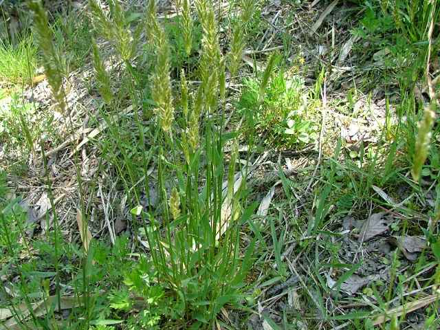 | 多年草 ヨーロッパ原産。路傍や庭園、原野などに生育し、やや密に群生する。茎は叢生し直立する。高さ30〜60cm。葉は長さ5〜10cm、幅3〜6mm。柔らかく、両面に長い毛がある。葉舌は鋭形、長さ2〜2.5mm。葉鞘は無毛。花序は穂状、長さ3〜7cm。小穂は線状披針形、長さ8〜9mm、光沢があり芒をつける。1小穂3小花であるが、第1と第2小花は退化して、護穎のみとなる。花期には第2包穎の先に、退化した第2小花の芒と第3小花の2本の柱頭が現れる。第3小花は両性、護穎と内穎は平滑、無毛。果実は長さ1.4〜1.7mm。花期は5〜7月。(日本イネ科植物図譜) 学名は、Anthoxanthum odoratum イネ科ハルガヤ属 |