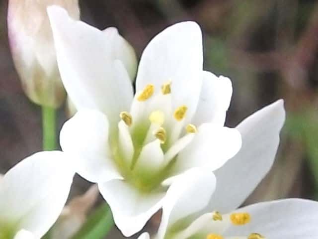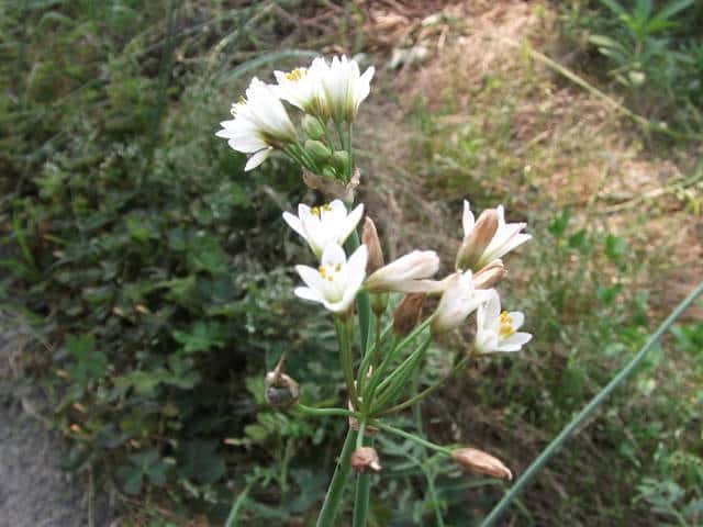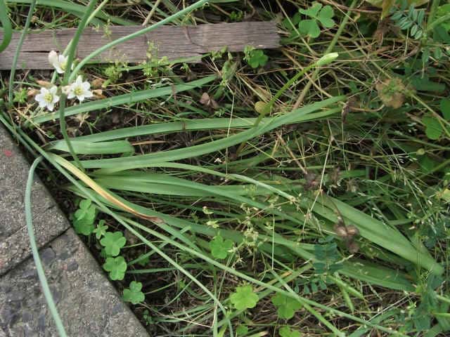 | 多年草 北アメリカ原産。明治年間の中頃に渡来したとされ、関東地方以西に帰化している。地下に直径1cmほどの鱗茎があり、長さ30cmほどの線形で柔らかい葉を数枚出す。長さ50cmほどの花茎をのばし、直径1.5cmほどの白色で淡紅色の脈の入った6弁の花を房状につける。種子は長さ2mmほどで黒色。ニラ臭はない。花期は春〜夏。(日本帰化植物写真図鑑) 学名は、Nothoscordum gracile ヒガンバナ科ハタケニラ属 |