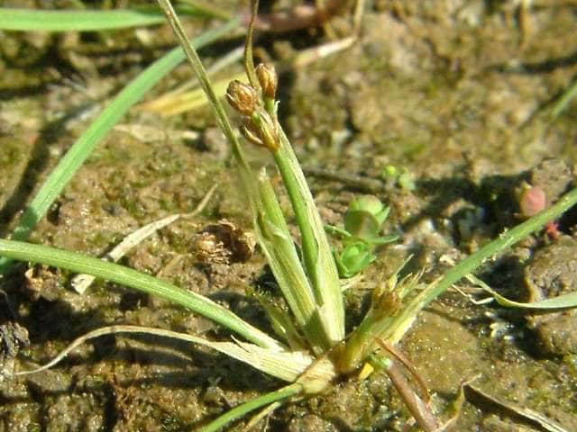 | 1年草 北海道〜九州の田畑の畦や日当たりの良い湿地に生える。植物体は叢生し、稈は高さ20〜60cm、平滑、基部に無葉身の鞘がある。基部の鞘は淡色から褐色、扁平。葉は扁平、幅約2mm。花序は数回分枝し、散形で複生、長さ4〜8cm。苞葉の葉身は刺状で花序より短い。小穂は広卵形、長さ2.5〜4mm、褐色。鱗片は卵形、長さ1mm。そう果は倒卵形、長さ約0.6mm、横断面は3稜形、乳白色で光沢があり、表面に浅い横紋があり乳頭状突起をまばらにつける。柱頭はややふくらみ、柱頭は3個。花期は7〜10月。(岡山県カヤツリグサ科植物図譜) 学名は、Fimbristylis littoralisa カヤツリグサ科テンツキ属 |