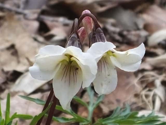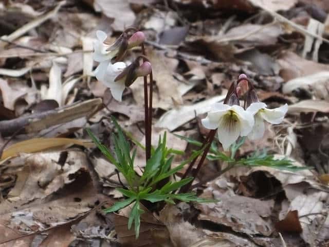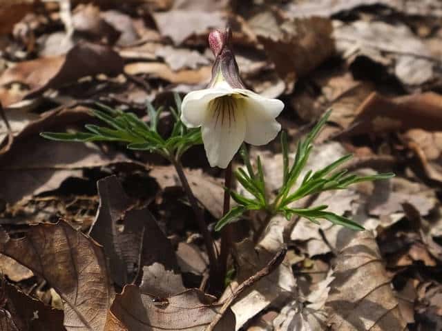 | 多年草 宮城県以南〜九州の山地の日当たりのよい草地や林内などに生える。葉は3全裂し、側裂片はさらに全裂し、5全裂状となる。小葉はさらに細かく切れ込む。花は直径1.5cm〜2cm、白色まれに淡紅色で芳香のあるものが多い。側弁は有毛。距は長さ4〜6mm。花期は3〜5月。(山に咲く花) 学名は、Viola chaerophylloides var. sieboldiana スミレ科スミレ属 スミレの分類 |
