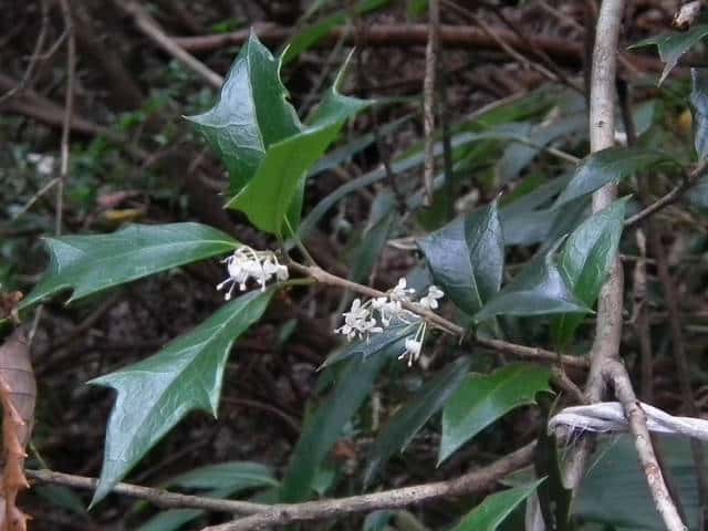 | 常緑小高木 関東地方以西〜沖縄の山地に生える。高さ4〜8mになる。樹皮は灰白色。若い枝には微細な突起毛がある。葉は対生。葉身は長さ3〜7cm、幅2〜4cmの楕円形。厚い革質で硬く、表面は光沢がある。裏面は淡緑色で緑色の細点がある。若木の葉は先端が鋭い刺状になった大型の歯牙が2〜5対あるが、老木の葉は全縁。葉柄は長さ7〜12mm、微細な突起毛がある。雌雄別株。葉腋に香りのよい白い花が束生する。花冠は直径約5mmで、4裂し、裂片はそり返る。雄しべは2個。雄花は雌しべが小さく、結実しない。両性花は雌しべが長くつきでている。果実は核果。長さ1.2〜1.5cmの楕円形で、翌年の6〜7月に紫黒色に熟す。核には網状の突起がある。花期は11〜12月。 冬芽は赤みがかった黄緑色で、先端はとがる。白い短毛がある。(樹に咲く花) 学名は、Osmanthus heterophyllus モクセイ科キンモクセイ属 似た花にヒイラギモクセイがあり、花冠裂片が反り返らない。 |