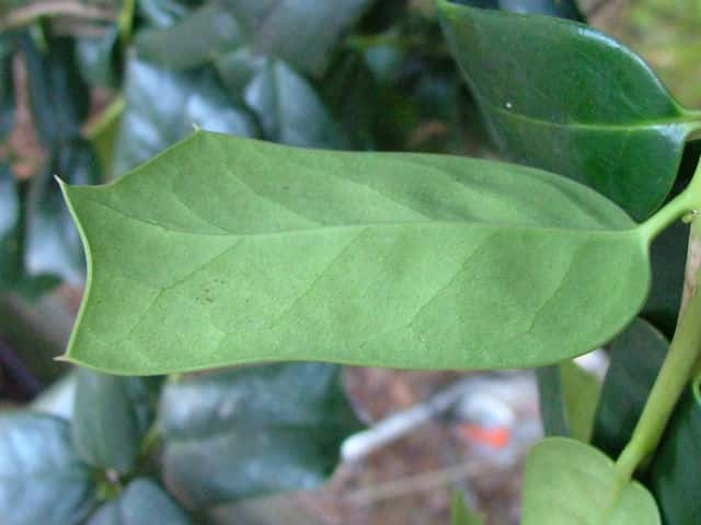 中国原産。樹高2〜4m。葉は葉身が長さ5〜8cm、葉柄2〜5mm、革質、互生、四角形状をした長楕円形、硬い刺状の鋸歯が普通2〜3対ある。老木ほど刺が減り、全縁の葉が増える。雌雄異株。花は白色、実が熟すると鮮紅色になる。別名シナヒイラギ、チャイニーズ・ホ−リ−、ヒイラギモチ。花期は5月。