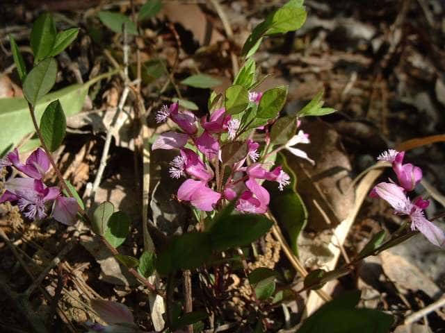 | 常緑多年草 北海道〜沖縄の日当たりのよいやや乾いた斜面に普通。茎は固くて斜上し、長さ10〜30cm。葉はごく短い柄があり光沢があって長さ1〜3cm、幅4〜15mm。葉腋から総状花序をだす。花序は主軸より短い。萼は5個、側片の2個は花弁状で卵形、長さ5〜7mm、紫色であるが、花後やや大きくなり緑色となる。花弁は下部で合生し下側の先は房状となる。雄しべは8個、花糸は基部合生する。果実は扁平、両側に翼があり心円形で、直径7〜8mm。種子は楕円形で付属体があり、白毛がある。花期は4〜7月。(原色日本植物図鑑) 学名は、Polygala japonica<・i> ヒメハギ科ヒメハギ属 |