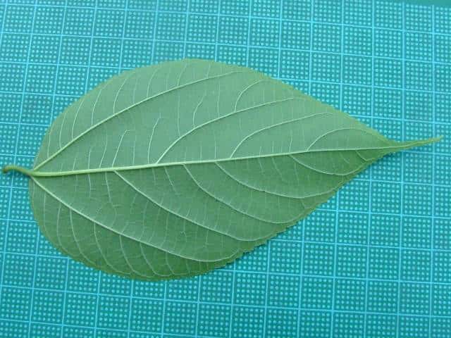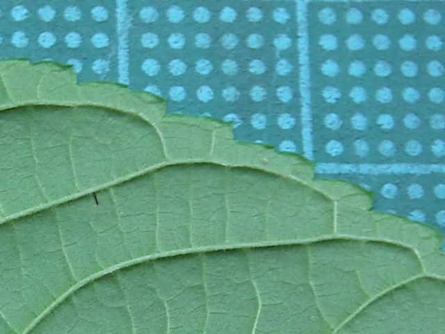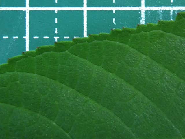 | ▼葉柄は長さ5mmほどと短い。 | ▼細かな鋸歯があり、葉脈が縁でつながる。 | |