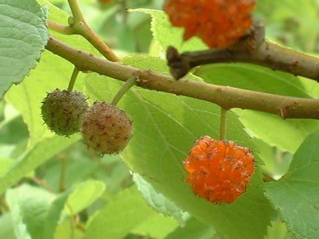 | 落葉低木 本州〜九州の丘陵から低い山地の林縁や道端、荒れ地に生える。高さ2〜5mになる。樹皮は褐色で狭楕円形の皮目が目立つ、シュートはややつる状にのびる。本年枝にははじめ短毛が密生するが、のちに少なくなる。葉は互生。葉身は長さ4〜10cm、幅2〜5cmのゆがんだ卵形。切れ込みのないものから2〜3裂するものまである。縁にはやや細かい鈍鋸歯がある。質は薄く、表面は短毛が散生し、裏面脈上にも短毛を密生する。葉柄は5〜10mm、短毛が散生する。雌雄同株。新枝の基部の葉腋に雄花序、上部の葉腋に雌花序をつける。雄花序は長さ約1cmの柄があり、直径約1cmの球形。雌花序は柄が短く、直径約5mmの球形で、赤紫色の花柱が目立つ。花柱は長さ約5mm、基部に2分岐した柱頭の名残りの突起がある。果実は集合果。直径1〜1.5cmの球形で、6〜7月に橙赤色に熟す。食べられるが、口当たりが悪い。花期は4〜5月。 冬芽は卵状三角形。褐色で無毛の芽鱗が2個ある。側芽は枝に圧着してつくのが特徴。葉痕は扁円形、左右の肩に托葉痕がある。(樹に咲く花) 学名は、Broussonetia monoica クワ科コウゾ属 コウゾはカジノキとヒメコウゾの雑種とされ、雌雄異株、雌雄同株。本年枝は有毛。葉柄は1〜2cm。冬芽の芽鱗は有毛。 ヒメコウゾは葉柄が1cm弱と短く、鋸歯が細かい。ヤマグワ、マグワは葉柄が2cm以上あり、鋸歯が粗く尖る。 |