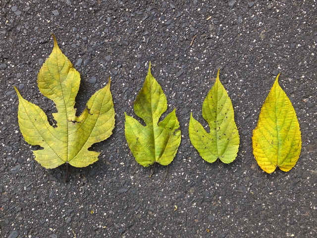 | ▼2014年11月24日 幼木の黄葉 長海 | ▼葉脈が縁で合流する。 | ▼5裂する葉。 |