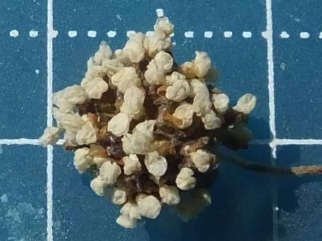 | ▼種子は直径約1.5mm、丸みのある四角形。 | ▼表面に凸点がある。 | |