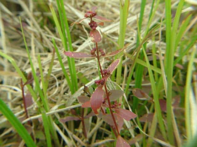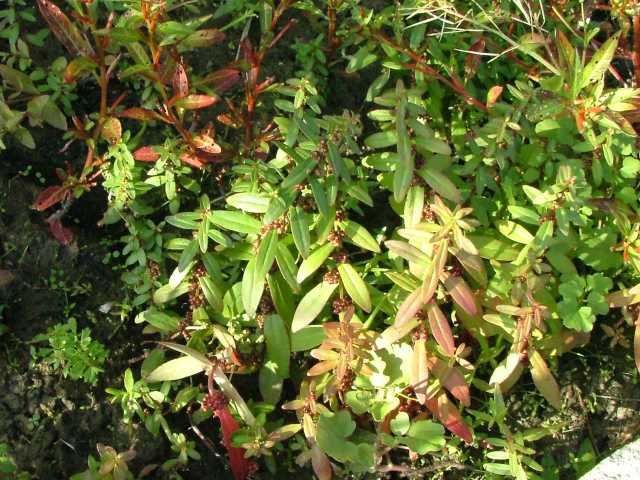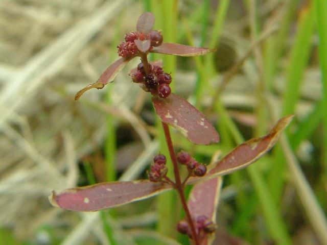 1年草 本州〜琉球の水田や湿地に生える。茎は直立し、毛はなくて、4稜があり、枝を分け、高さ10〜30cmになる。葉は対生し、ほとんど柄がなく、広線形〜披針状長楕円形、先は鋭形、基部はやや耳状となって茎を抱き、長さ1.8〜5cm、幅2〜12mm。花は集散花序をなし、腋生する。花径は約1.5mm。萼筒は鐘形、長さ約1.5mm、4裂片は三角形。花弁は小さく4個で、倒卵形、淡紫色。雄しべは4個。さく果は球形、径約2mm、紅紫色で、萼より長い。種子は細かく、三角形。花期は9〜11月。(日本の野生植物) 学名は、Ammannia multiflora ミソハギ科ヒメミソハギ属 |