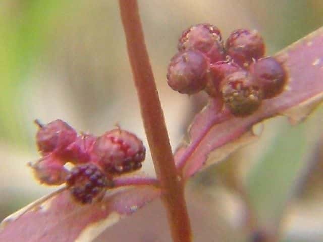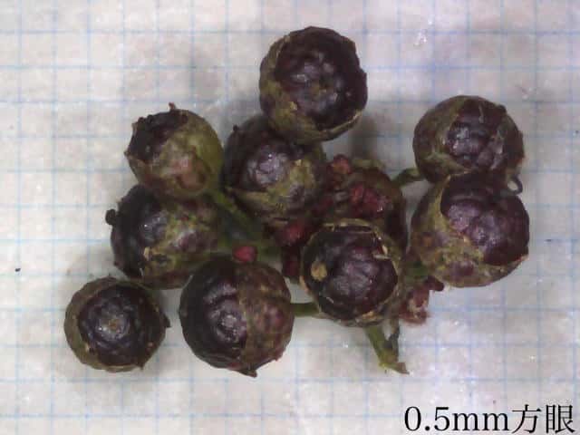 | ▼果実は直径約2mm。 | ▼果実の下半部を萼が包む。 | |