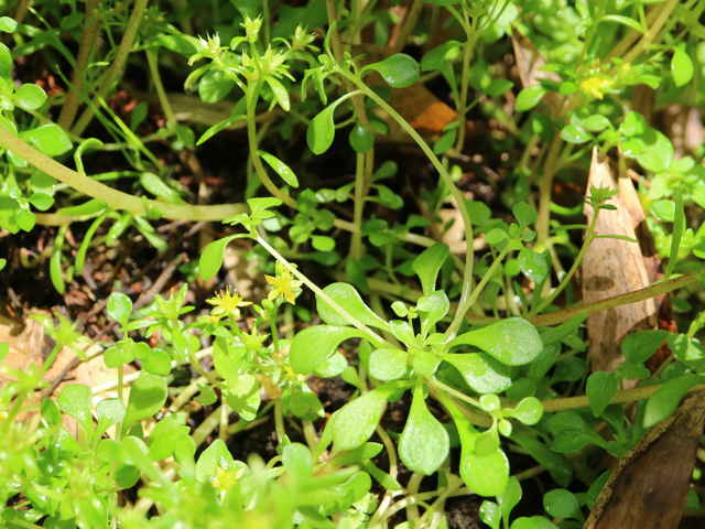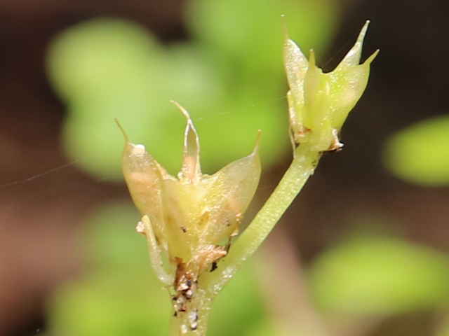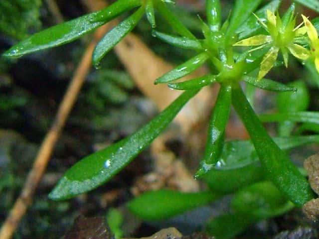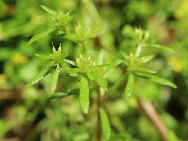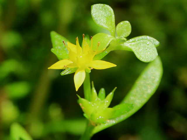 | 多年草 本州(関東地方以西)、九州の山地谷沿いの湿った岩上に生える。葉は互生し、上部では広線形で長さ5〜20mm、幅2〜3mm。集散状の花序を頂生し、黄色の5弁花をつける。花弁は長さ4.5〜6mm。雄しべ10個は2列に並び、長さ4〜5mm。裂開寸前の葯は橙赤色。子房の基部には乳白色の蜜腺がある。萼は花弁より短い。花後走出枝をだし、先端にロゼットをつけて越冬する。花期は5〜6月。(山に咲く花) 学名は、Sedum subtile ベンケイソウ科マンネングサ属 |