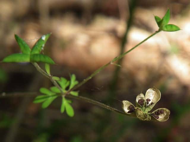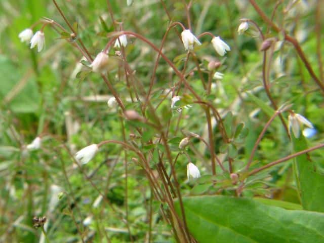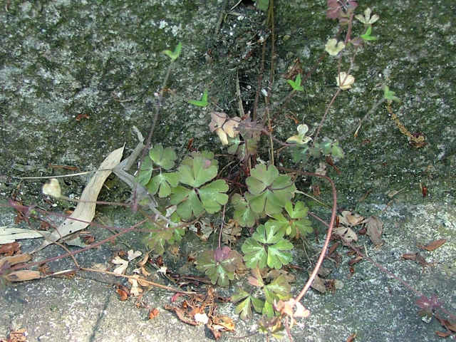 | 多年草 関東地方〜九州のやぶの縁や石垣などにふつう。地下茎は長楕円形の塊状となり、茎は高さ20〜35cm、細くて軟毛があり、上部は分枝する。根出葉は多数、長柄があり、3出複葉、小葉は2〜3中〜深裂し、さらに2〜3浅裂、裂片は円頭、上面無毛、下面粉白で下部に軟毛がある。茎葉は少なく、上部のものほど葉柄が短い。枝の先に下向きの花をつける。花は小さく直径4〜5mm、萼片は長楕円形、長さ5mm、白色で微紅、花弁は長さ2.5mm、下部は筒となり、きわめて短い距がある。雄しべ9〜14、雌しべ2〜4。袋果は上向き、花柱を含めて長さ6mm。種子は卵形、長さ1mm、黒色、小さい横じわを密布する。花期は4〜5月。(原色日本植物図鑑) 学名は、Semiaquilegia adoxoides キンポウゲ科ヒメウズ属 |