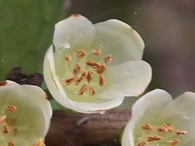 | ▼花は長さ約5mm、直径約5mm。 | ▼花の縦断面、花弁は5個。 | ▼雄花の雌しべは退化している。 |