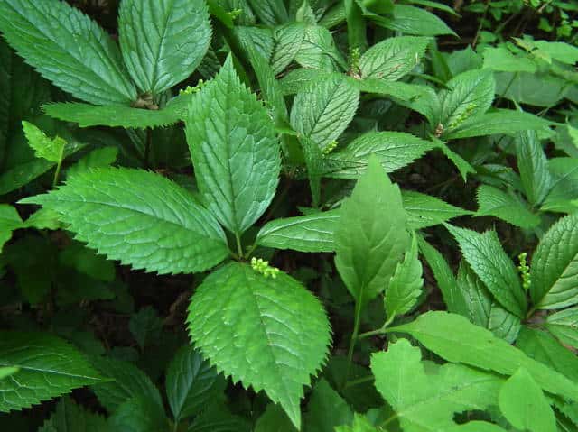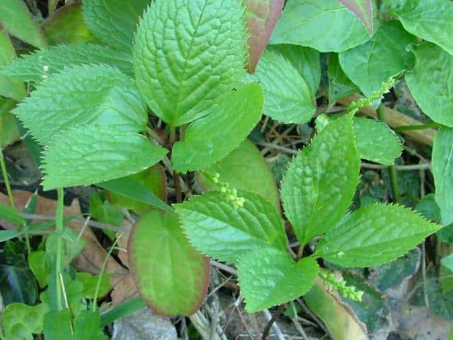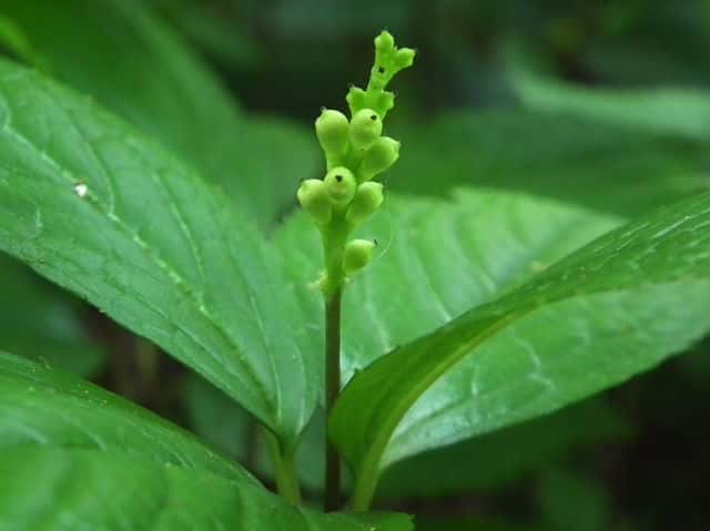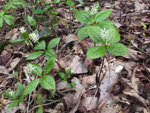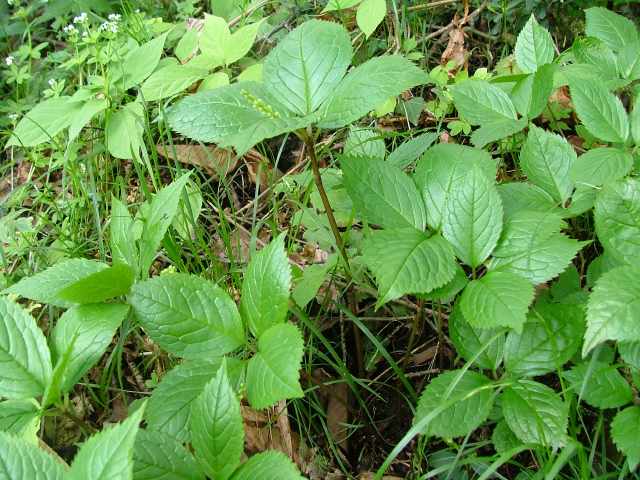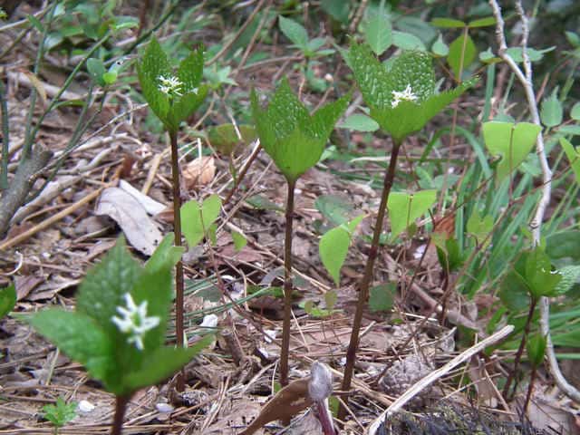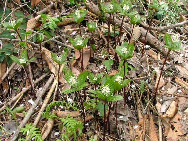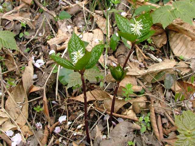| 多年草 北海道〜九州の山野の林内や草地に生える。高さ10〜30cm。茎は直立し、はじめ赤紫色を帯びるものが多い。茎の下部の節には膜質の鱗片状の葉がつく。上部には2対の葉が十字形に対生するが、節間がごく短いので、4個の葉が輪生しているように見える。葉は光沢のある濃緑色で、長さ6〜10cmの楕円形〜卵状楕円形。先は短く急にとがり、縁には鋭い鋸歯がある。葉がのびきる前に葉の中心から白い花穂を1個(まれに2個)のばす。花には花弁も萼もなく、雌しべ1個と子房の横腹に雄しべ3個がつく。雄しべの花糸は白色でよく目立つ。外側の2個の雄しべは基部の外側に黄色の葯があり、中央の雄しべには葯がない。果実は核果で長さ2.5〜3mmのゆがんだ倒卵形。花期は4〜5月。(野に咲く花) 学名は、Chloranthus japonicus センリョウ科チャラン属 |