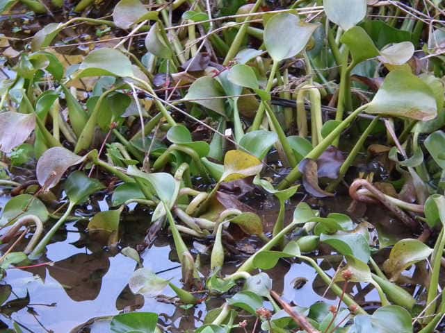 多年草 南米原産。湖沼や溜池、河川、水路などに生育する浮遊植物。走出枝を伸ばして娘株を殖やす。葉は根生、高さ10〜80cm、ときに1mを超える。葉身は卵心形〜円心形で長さ5〜20cm、幅5〜18cm、葉柄は中ほどがふくれて浮嚢となるが、根を土中に下ろしたときや過密状態で生育するときは浮嚢が発達しない。総状花序に淡紫色(まれに白)の花を多数つける。花被片は6、雄しべは6本、そのうち3本は長く他の3本は短い。雌しべは3心皮が合着して1本。花には雌しべと雄しべの長さの異なる3型(長花柱花、中花柱花、短花柱花)があり、日本で広がっている系統は中花柱花または長花柱花を持つものである。花後、花茎は湾曲して花序は水没し水中で結実する。果実はさく果で、長さ約1mmの細かい種子を多数含む。花期は6〜11月。(日本の水草)