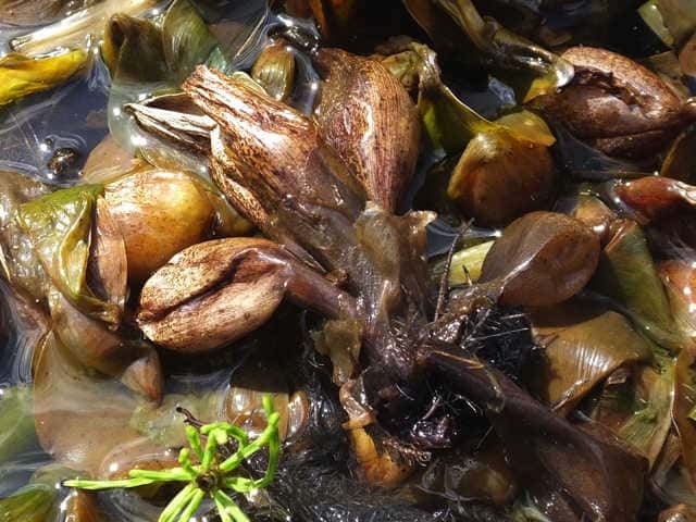 「ホテイアオイの冬越しは、冬越し株、殖芽、種子の3の方法が考えられる。種子は、この花の花粉を運ぶ生き物が日本にはいないことから、結実しにくいといわれている。殖芽は、成長の終わりに根茎の先端でできる新芽であるが、気温マイナス3.9℃が1、2 日続いても、その間に暖かい日があれば生き延びると言われている。株の状態での冬越しは、3℃以上あれば可能とされる。」(木浜内湖におけるホテイアオイの異常繁茂の弊害と抑制対策について)