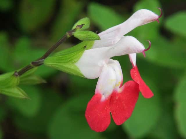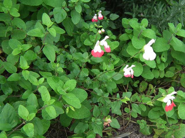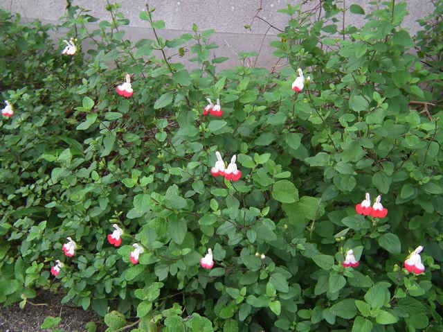 | 多年草 メキシコ北部原産。高さ1.5mほどになり、茎の基部は木質化する。葉は卵形で対生し、縁には鋸歯がある。茎頂や葉腋から花序を出し、赤色の花をつける。条件によって、赤い色の部分の割合が変化し、白一色、赤一色になることもある。花冠内の基部付近に1対の突起物がある。別名 サルビア・ミクロフィラ'ホットリップス' 花期は4〜11月。 学名は、 Salvia microphylla 'Hot Lips' シソ科アキギリ属 似た花に同じくチェリーセージと呼ばれるサルビア・グレッギー(Salvia greggii)があるが、花冠内の基部に突起物がないとされる。 |