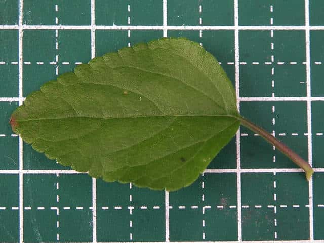 | ▼葉身は長さ約3cm。 | ▼浅い小さな鋸歯がある。 | |