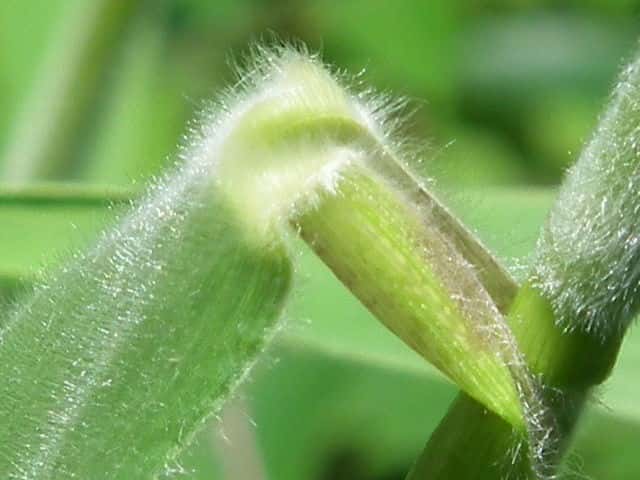 | ▼葉の裏面の毛。 | ▼葉舌は短く毛が密生する。 | ▼節の下に腺があり毛がない。 |