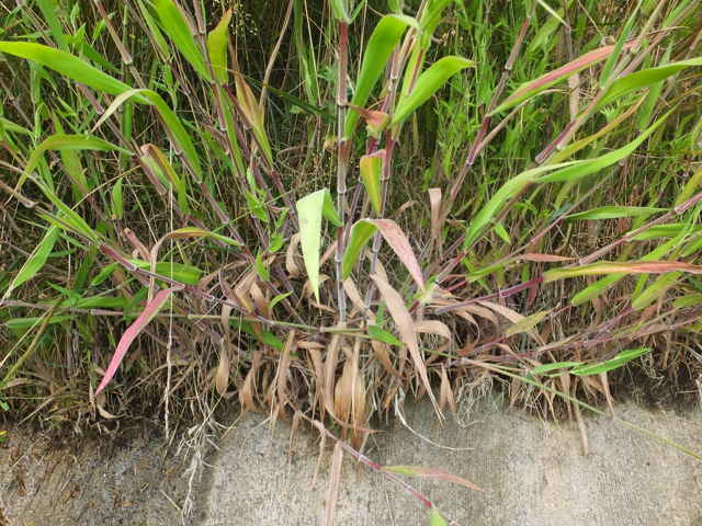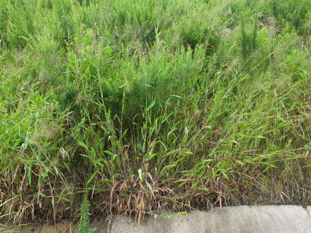 多年草 北アメリカ原産。1977年頃に京都府宮津市で見いだされた。道路工事で吹きつけた牧草に混じっていたとされる。全体に開出する毛を布く。稈は直立して上部で分岐し、高さ1.2mほどになる。葉身は広線形、葉鞘は節間より短い。長さ15cmほどの細かく分岐した円錐形の穂を出し、長さ2.4mmほどの小穂をややまばらにつける。小穂にも毛がある。花期は夏。(日本帰化植物写真図鑑) 学名は、Dichanthelium scoparium イネ科ケヌカキビ属 よく似ているとされるニコゲヌカキビは、高さ20〜70cmと小型で、小穂が長さ1.5〜1.7mmと小さい。 名前はまだ不明だがホウキヌカキビに似たものが林道に生えている。 |