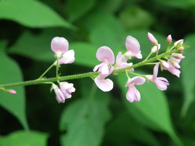 | 多年草 本州〜九州の山野の林内に生える。高さ50〜120cmで毛がある。葉は7または5小葉からなり、小葉は卵形〜長楕円形、長さ8〜16cm、幅2〜6cm。托葉は線形で長さ7〜8mm。花は長い総状花序を作って開き淡紅色で長さ8〜10mm。萼は小さく5浅裂し有毛。果実は8〜10mmの柄があり、1〜2節、節間は長さ10〜13mm、表面は単鈎毛があってよくものにくっつく。花期は8〜9月。(原色日本植物図鑑) 学名は、Hylodesmum oldhamii マメ科ヌスビトハギ属 |