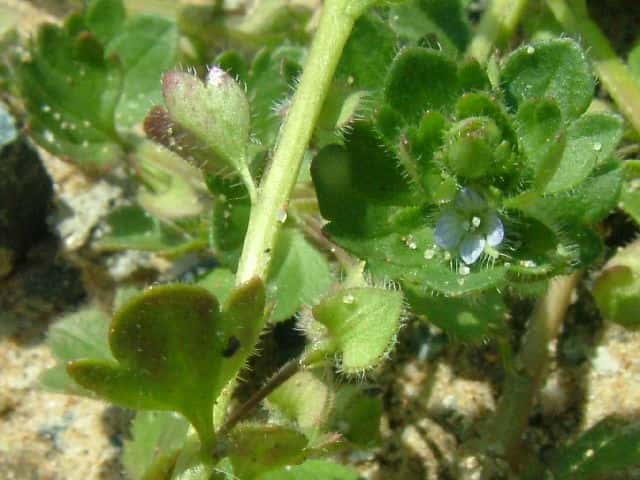 | 越年草 ヨーロッパ原産。畑や道ばたなどに生える。茎は下部で横に広がって、長さ10〜20cmになり、まばらに長毛が生える。葉は下部の少数のものは対生し他は互生、葉身は長さ7〜10mm、幅8〜12mm、やや肉質でつやがあり、広円形で1〜2対の大きな鋸歯があり、立った長毛がまばらに生える。葉腋ごとに1花をつける。花柄は葉とほぼ同長、萼裂片は卵状三角形でとがり、縁には長白毛が生える。花冠は淡青紫色、浅い皿形で径2〜2.5mm。さく果は球形で先は浅くへこみ、長さ幅とも2.5〜3mm、1〜3個の種子がある。種子は中空の半球形で表面にしわがあり、長さ2.5mm。花期は3〜5月。別名ツタノハイヌノフグリ。(日本の野生植物) 学名は、Veronica hederaefolia オオバコ科クワガタソウ属 似た仲間 |