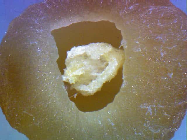 | ▼直径約5mm。4個の種子が入っている。 | ▼3個の種子をはずした。 | ▼種子が腹面で胎座に繋がっている。 |