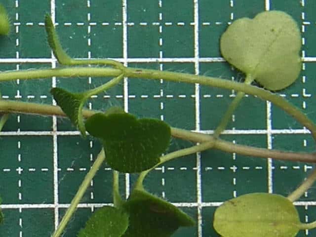 | ▼葉は長さ約6mm。 | ▼茎の基部に子葉が残る。 | |