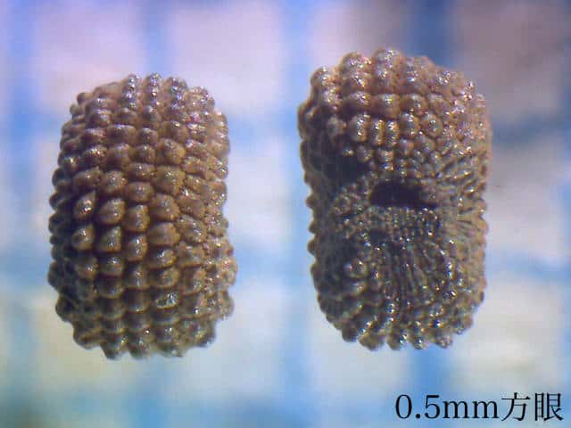 | ▼果実を割ると種子が詰まっている。 | ▼種子には網目状の突起がある。 | ▼種子は直径約1mm。 |