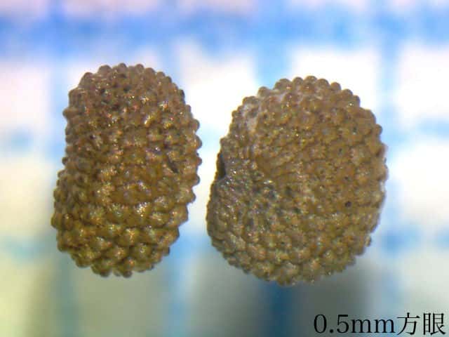 | ▼種子は長さ0.8〜1mm。 | ▼種子の背面(左)と腹面(右)。 | ▼種子の表面には小突起が密生する。 |